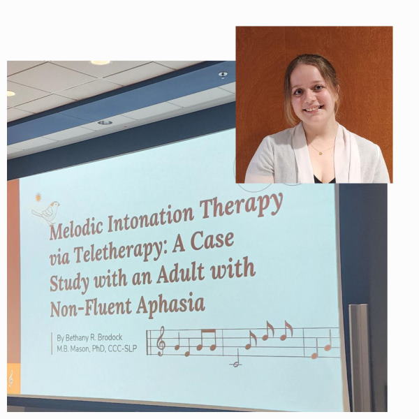 Bethany Brodock presented her senior honors thesis Melodic Intonation Therapy Via Teletherapy: A Case Study with an Adult with Non-Fluent Aphasia during the 2024 Scholarship and Arts Symposium. Her thesis advisor was Dr. Mary Beth Mason, Professor of Communication Sciences and Disorders. Bethany expressed interest in continuing her research on this topic in graduate school. She was also the recipient of the “Beyond the Page” Library Award for her Statistics for the Social Sciences research project entitled The Association Between Education and Healthcare in Adults in the United States.