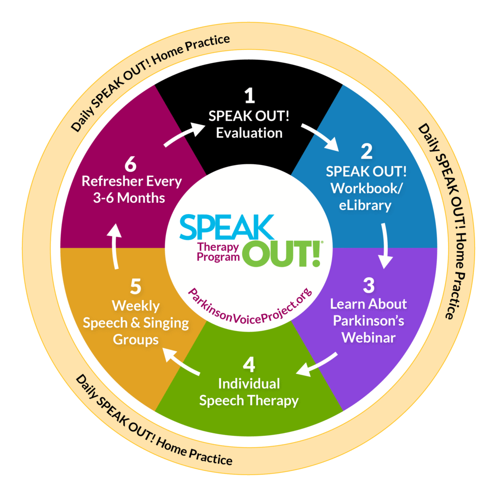 The SPEAK OUT! Therapy Program, developed by Parkinson Voice Project, is an evidence-based program helping individuals diagnosed with Parkinson’s and related neurological disorders regain and retain their speech and swallowing. This comprehensive program combines individual speech therapy with education and ongoing group support.