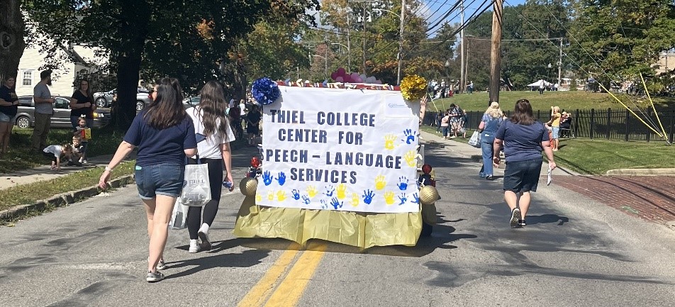 The Thiel College CSD/SLP Program celebrated full accreditation for the MS-SLP Program during Homecoming with a Center for Speech and Language Services float in the Homecoming Parade as well as tailgating in the Alumni Stadium. Clients from the clinic, recent graduates, faculty, staff and clinical supervisors joined in the festivities.