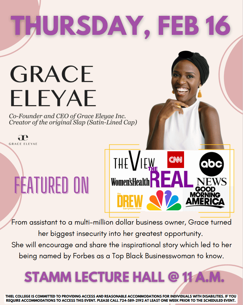 Entrepreneur Grace Eleyae will share her experience and inspire students through her journey as a black female entrepreneur founding a successful business.