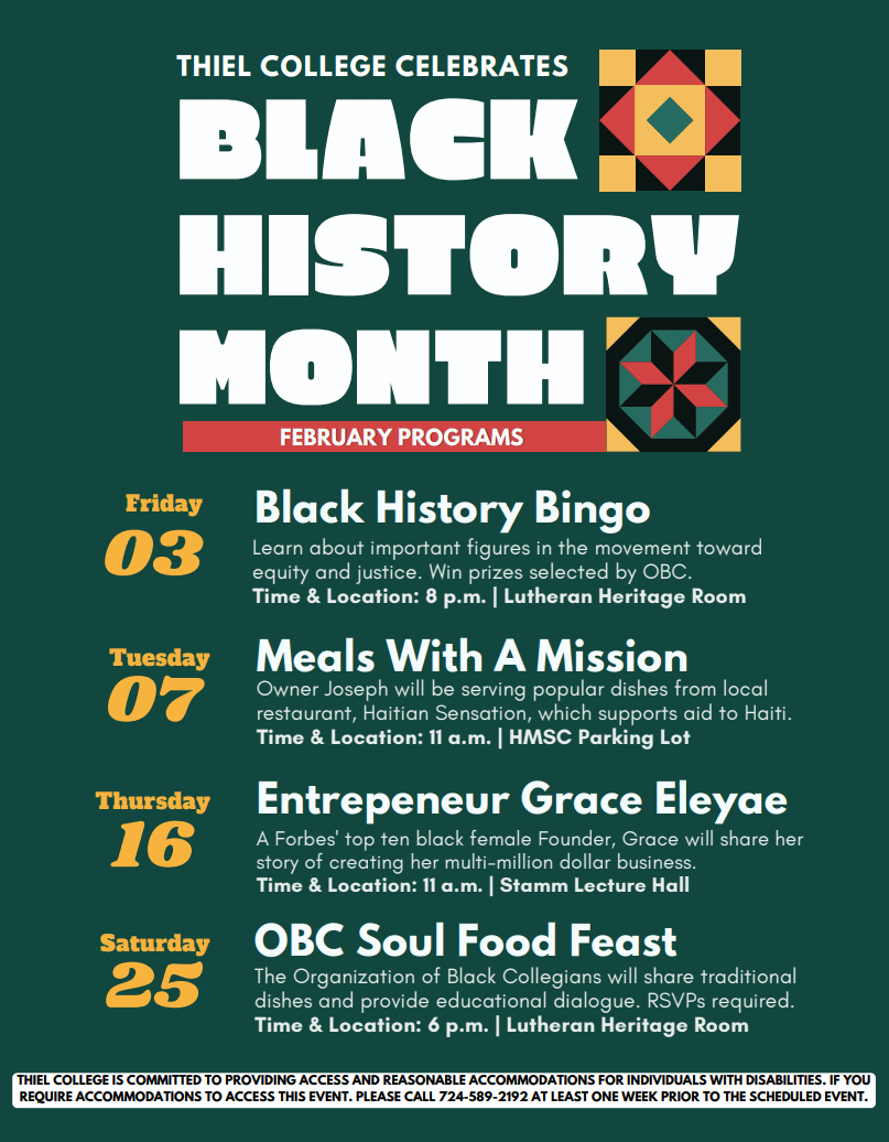 Thiel College is committed to providing access and reasonable accommodations for individuals with disabilities. If you require accommodations to access this event, please call 724-589-2192 at least one week prior to the scheduled event.