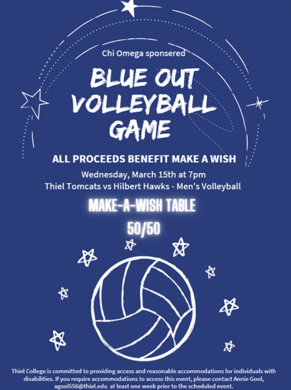 Support Chi Omega's philanthropy, Make a Wish by wearing blue at the Thiel Colleges Mens Volleyball game.