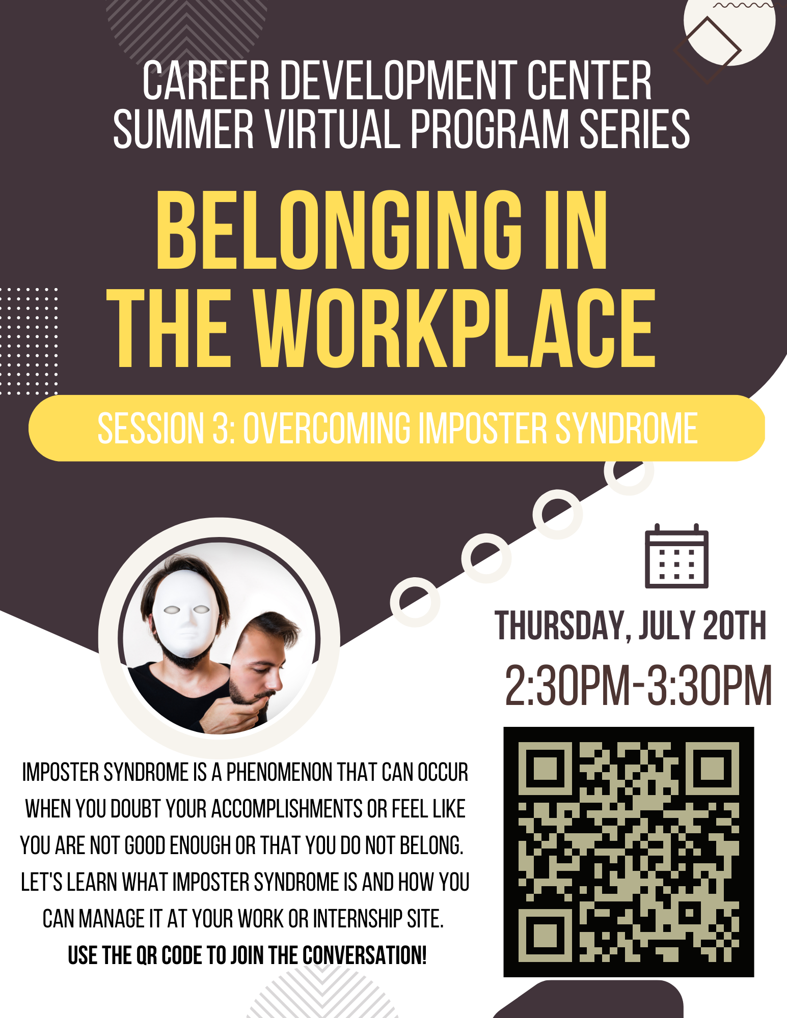 Imposter syndrome is a phenomenon that can occur when you doubt your accomplishments or feel like you are not good enough or that you do not belong. Let's learn what imposter syndrome is and how you can manage it at work or your internship site. Join the virtual conversation to learn more!