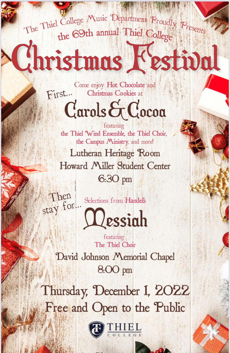 The Thiel College Music Department proudly presents the 69th annual Christmas Festival! First, come enjoy Hot Chocolate and Christmas Cookies at Carols & Cocoa featuring the Thiel Wind Ensemble, the Thiel Choir, and the Campus Ministry, and more!