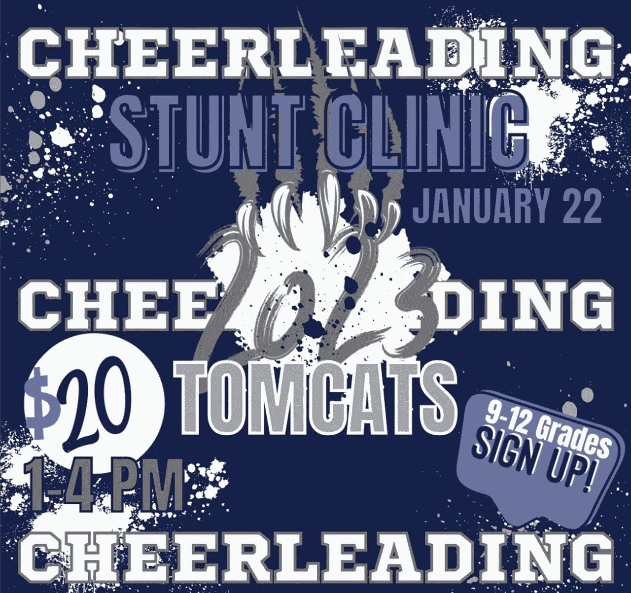 The cheerleading team is hosting a college prep stunt clinic for high school students. This is a fundraiser for the team's return trip to the National Association's College Nationals competition. The entry is $20.