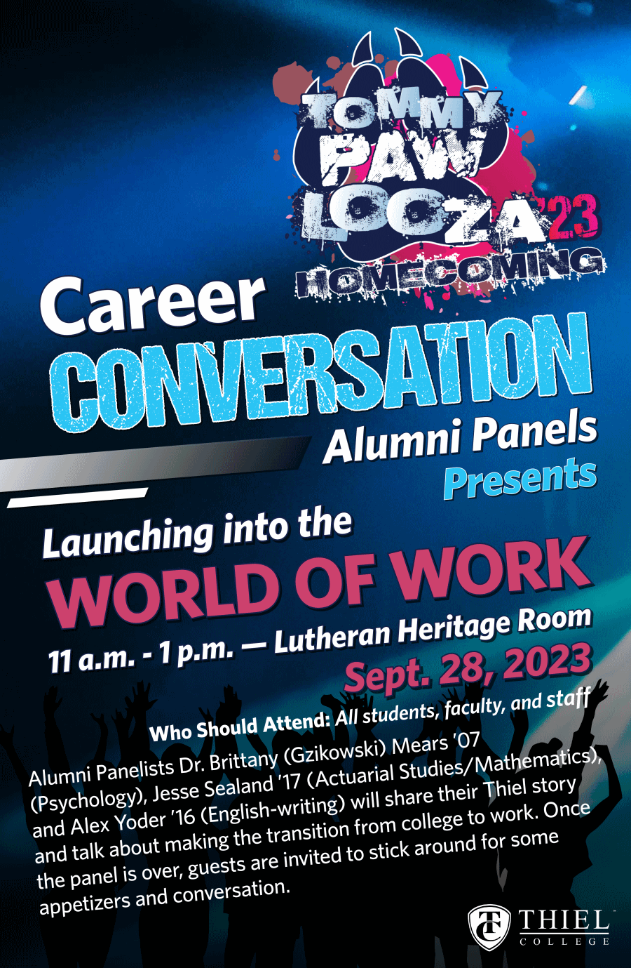 Alumni Panelists Dr. Brittany (Gzikowski) Mears ’07 (Psychology), Jesse Sealand ’17 (Actuarial Studies/Mathematics), and Alex Yoder ’16 (English-writing) will share their Thiel story and talk about making the transition from college to work. Once the panel is over, guests are invited to stick around for some appetizers and conversation.
