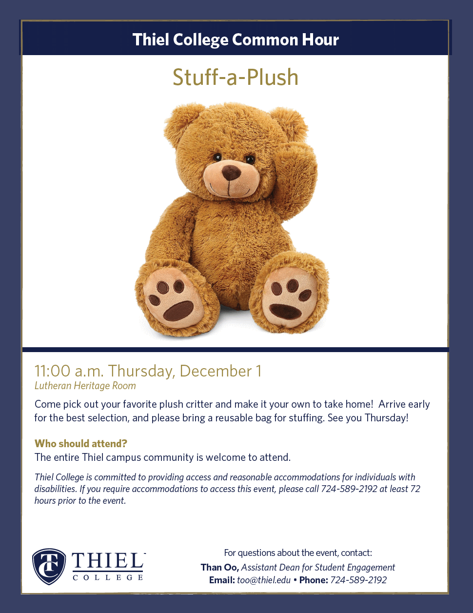 Thiel College is committed to providing access and reasonable accommodations for individuals with disabilities. If you require accommodations to access this event, please contact Than Oo at too@thiel.edu.