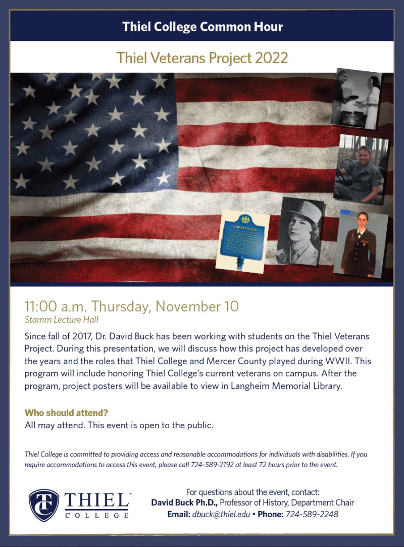 Since the fall of 2017, Dr. David Buck has been working with students on the Thiel Veterans Project. During this presentation, we will discuss how this project has developed over the years and the roles that Thiel College and Mercer County played during WWII. This program will include honoring Thiel College's current veterans on campus. After the program, project posters will be available to view in Langenheim Memorial Library.