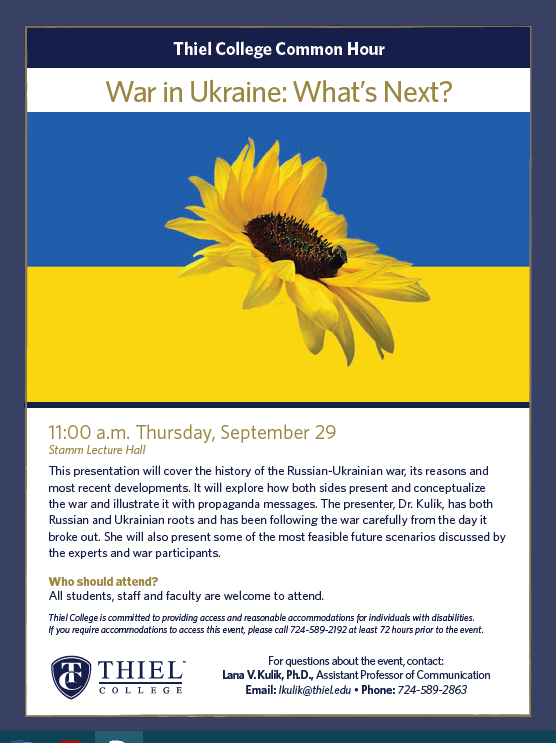 Students are encouraged to attend a special lecture about the war in Ukraine presented by Dr. Lana Kulik.