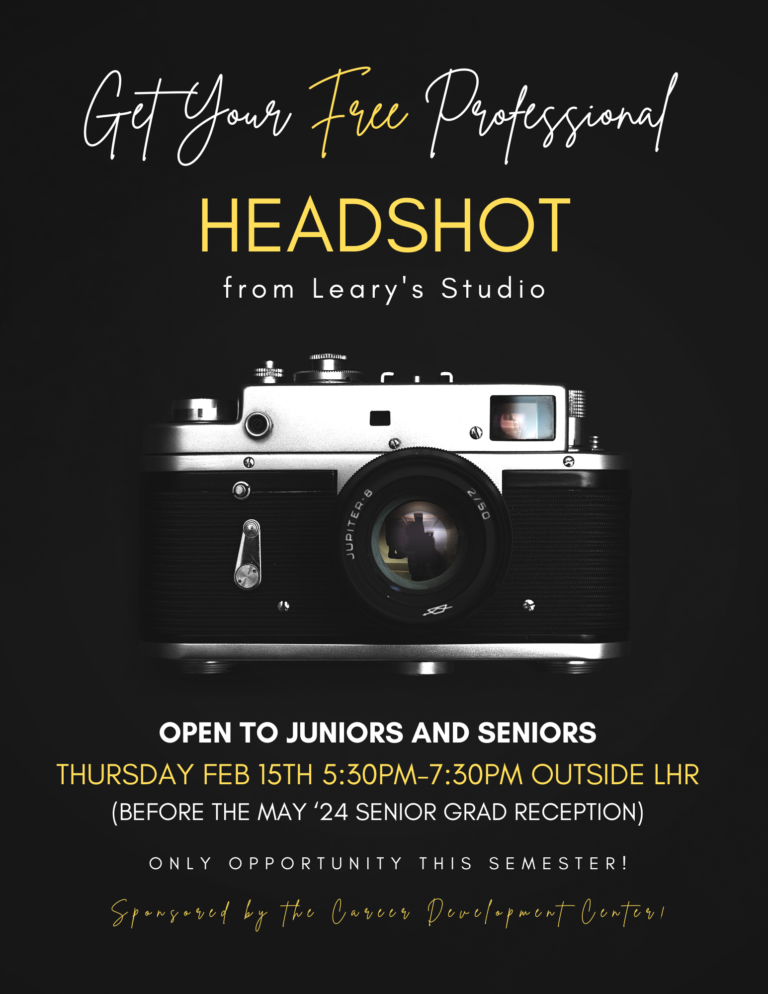 Juniors and Seniors are invited to get their professional headshot taken by Leary's Studio. Only opportunity of the semester!