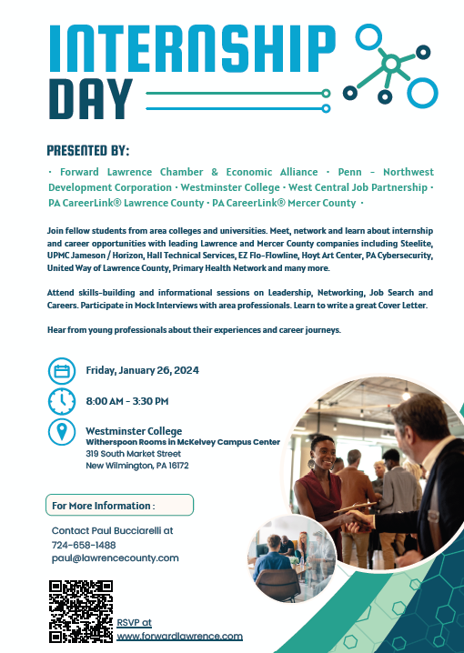 This is how the organizers describe the event: The event will feature multiple companies from Lawrence and Mercer counties who have internship opportunities, and we are inviting students from area colleges /universities including Grove City, Slippery Rock, BC3, PSU-Shenango, Thiel and Westminster to participate. In addition to networking with area employers, students will be able to attend a number of breakout sessions on leadership, job search strategies, networking, healthcare careers and similar.