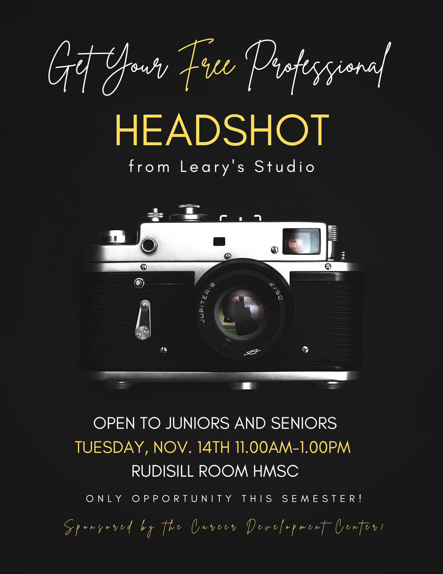 For National Career Development Week, Leary's Studio will be on campus to take professional senior head shots. Free to students.