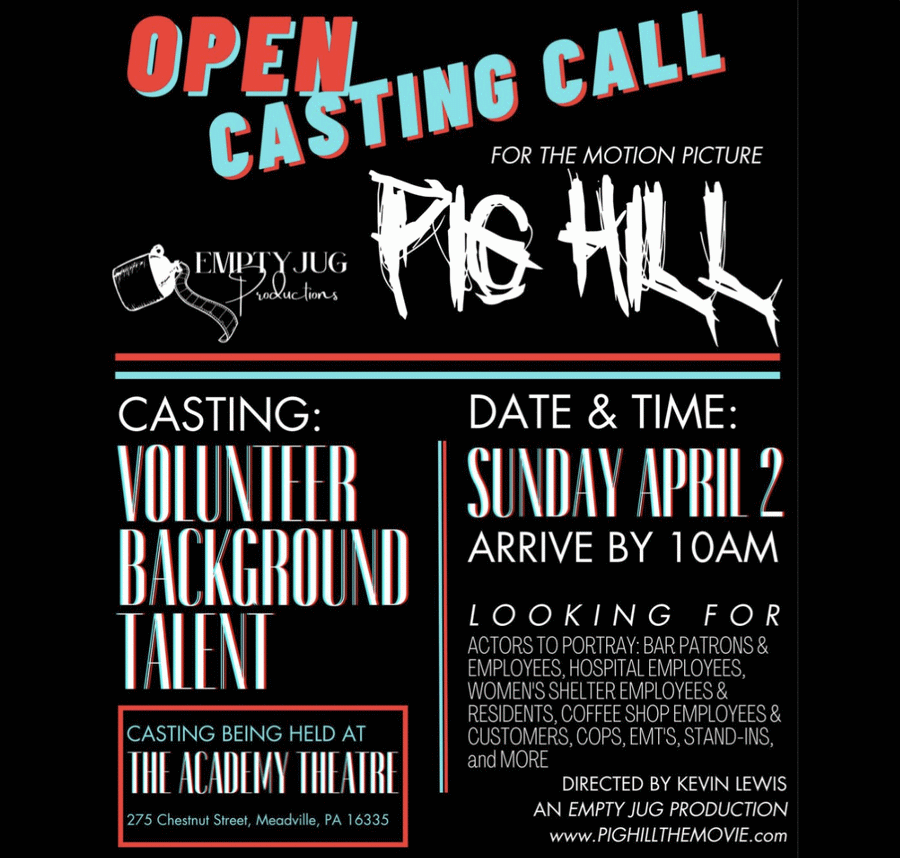 Open casting call for the motion picture Pig Hill. This will take place Sunday, April 2nd at The Academy Theater 275 Chestnut Street, Meadville PA 16335.