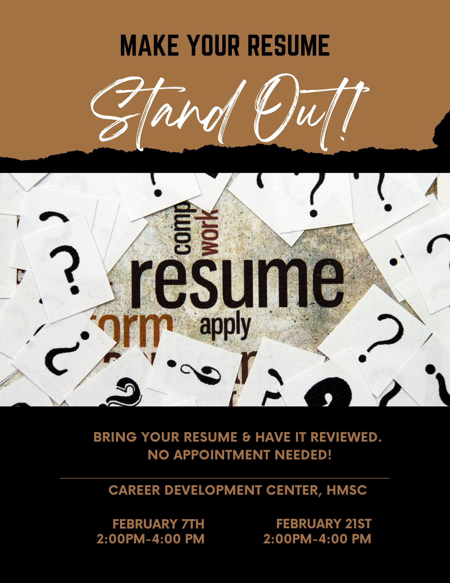 Bring your resume and have it reviewed. Make changes on the spot. No appointment needed!