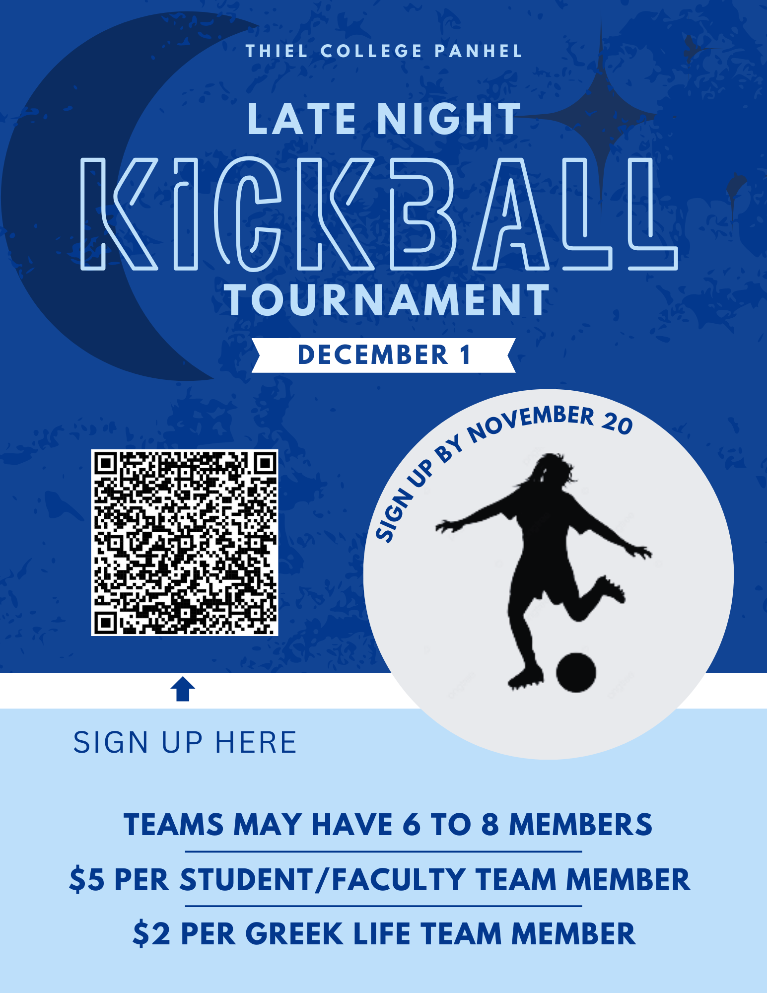 Thiel College Panhel is hosting a late night kickball tournament for all students and faculty to participate in. Each member is $5, but if you are involved with Greek Life it is only $2. Teams can have up to 8 members.