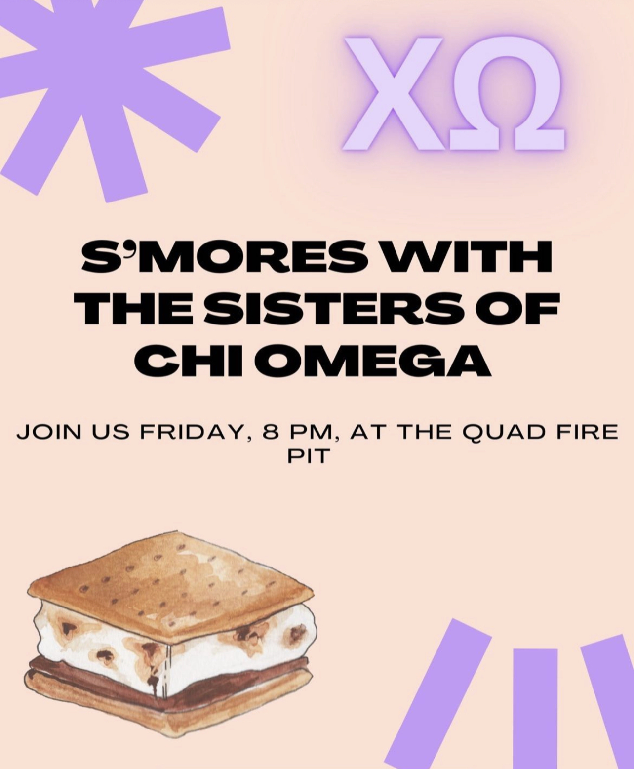 Join the sisters of Chi Omega to learn more about their sorority! They will be making smores, going over general information, and socializing at the Quad Fire Pits outside of Hodge.