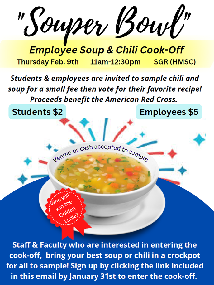 Staff & Faculty who are interested in entering the cook-off, bring your best soup or chili in a crockpot for all to sample! Sign up ( Will be available soon.)