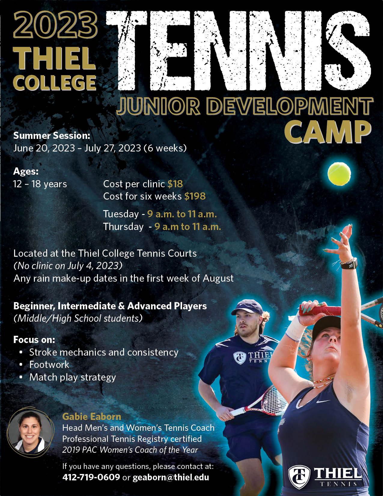 To register for the entire camp ($198) or attend a single session ($18), please contact Coach Gabie at geaborn@thiel.edu.
