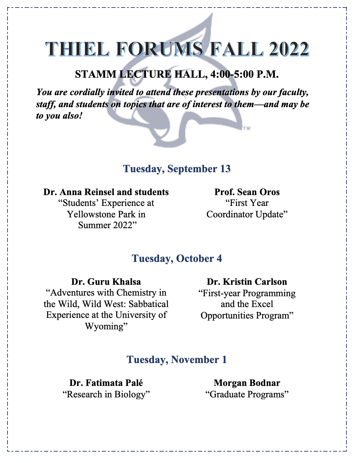 Thiel Forums are designed for faculty members, staff, and students to showcase areas of research, academic interest, or travel experiences they are currently pursuing or have recently participated in. Audience members are encouraged to attend to support the presenters. Some classes may offer extra credit to students for attending.