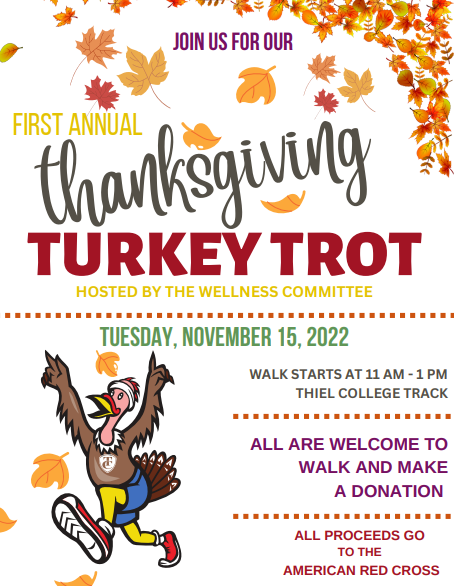 Come on down to the Track and join The Wellness Committee for our First Annual Turkey Trot to support the American Red Cross! If you walk 4 laps around the track...that’s a mile!!