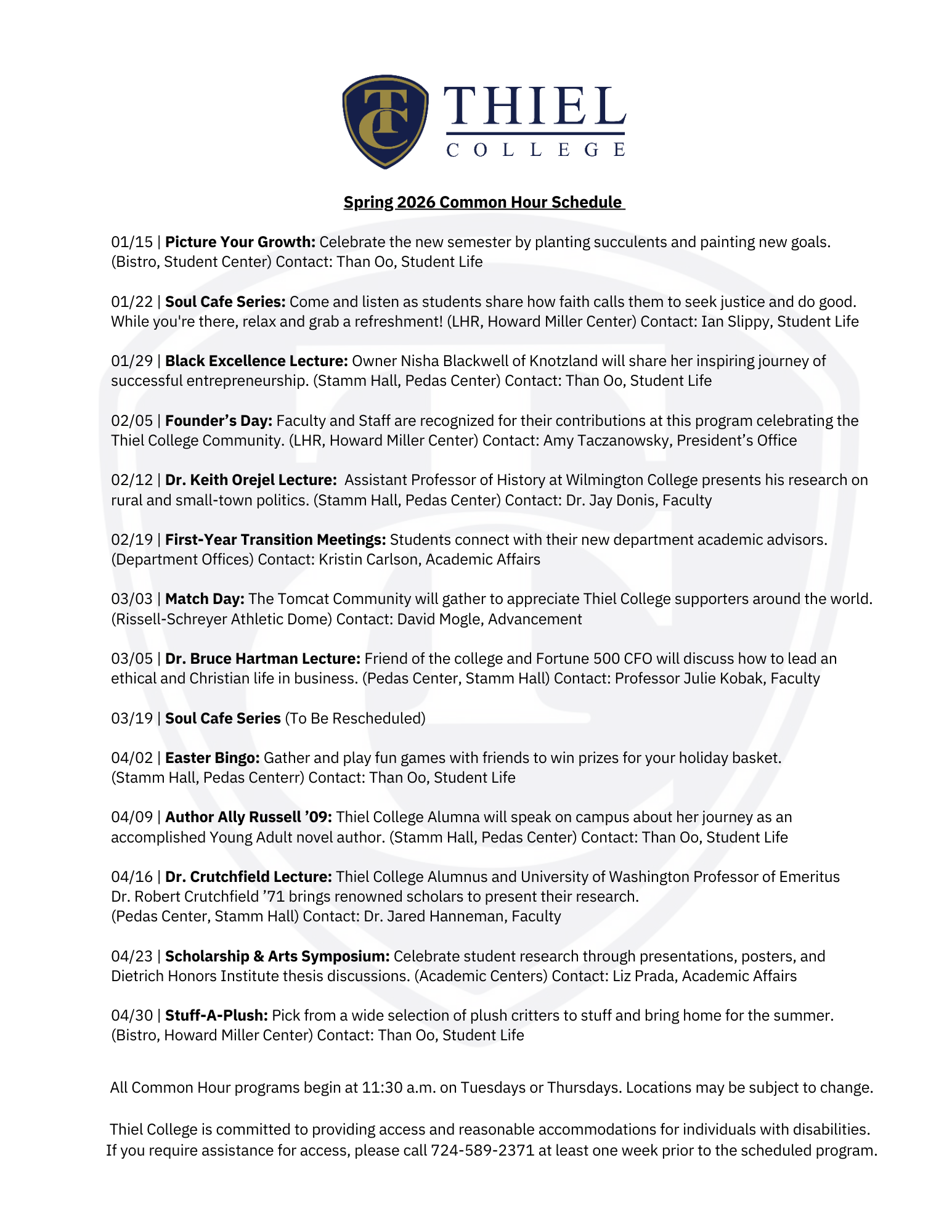 Every Tuesday, Thiel College has a Community Hour from 11:30 a.m. to 12:30 p.m. During this hour, no classes or practices are held. Similarly, Common Hour occurs every Thursday on campus. From the hours of 11:30 a.m. to 12:30 p.m. and students are encouraged to participate in special programs during this time.