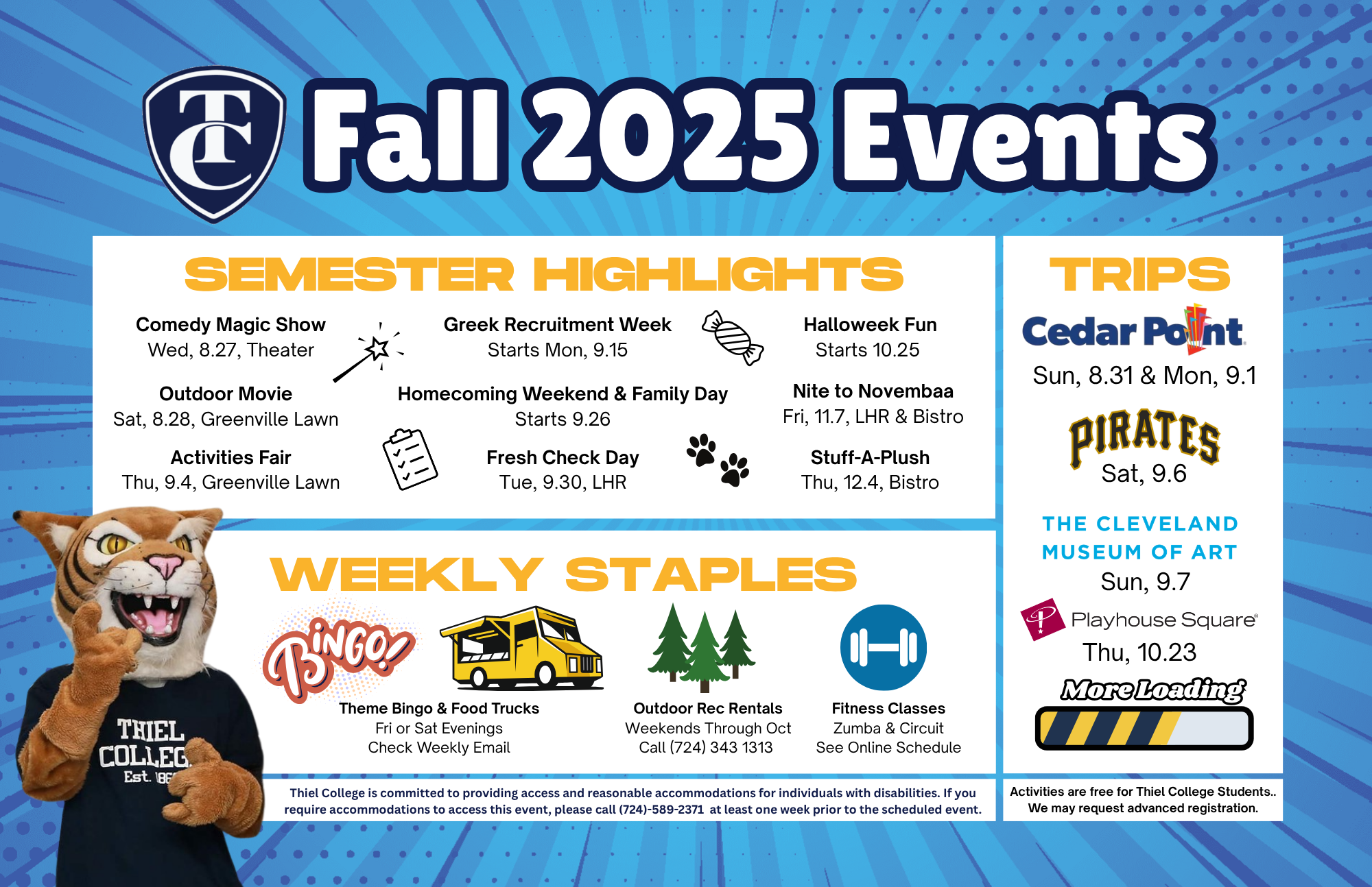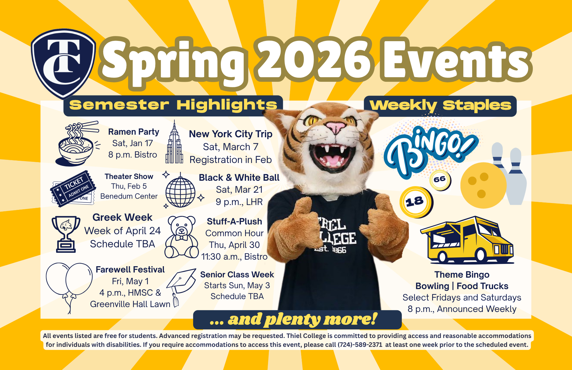While attending Thiel College, students can look forward to cultivating rich experiences outside of the classroom.Look for upcoming event announcements sent weekly to your thiel.edu e-mail. We look forward to connecting with you!