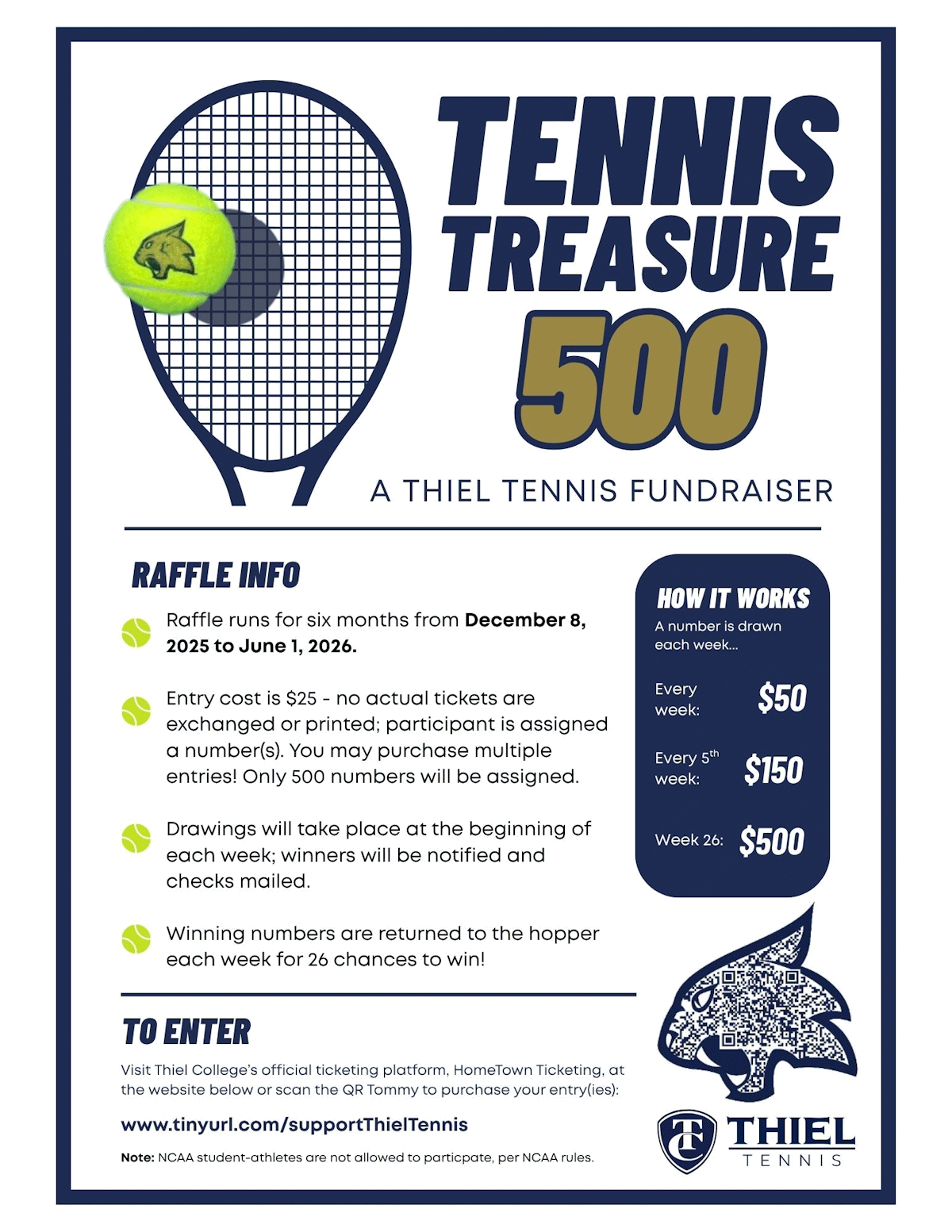 The Thiel Tennis Treasure 500 Raffle begins tomorrow.