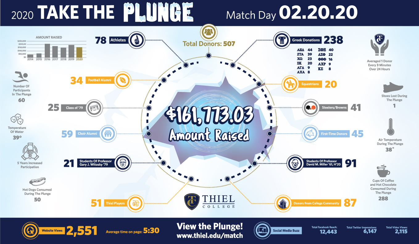 A record-setting 507 donors contributed $161,773 to The Thiel Fund, topping the campaign’s goal of 400 contributors. This year’s theme was “Take the Plunge.” When the 400-donor level was surpassed, a video of about 60 Thiel College students, alumni and employees jumping into freezing Pymatuning Reservoir was released. The Thiel Fund is an unrestricted source of funds that can be used to fund scholarships and unforeseen needs of the College.