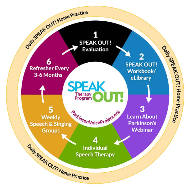 SPEAK OUT! is based on principles of motor learning. Patients learn to convert speech from an automatic function to an intentional act. The program combines education for the patient and family, individual speech therapy, daily home practice using workbooks, flashcards, and online practice sessions, weekly speech and singing groups, and regular re-evaluations.