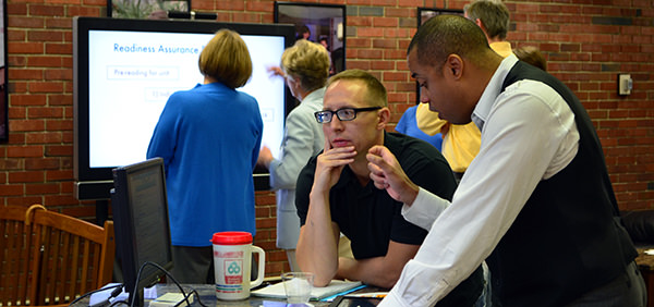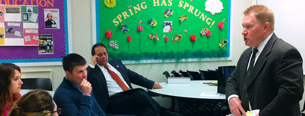 Education majors in Dr. Doug Hazlett’s class were the recipients of a presentation on the new Pennsylvania teacher evaluation process by Mark Ferrara (seated in background), superintendent of Greenville area school district and Brian Bronson (speaking), elementary principal. Students learned about the process to document best practices in teaching pedagogy from the local school administrators.
