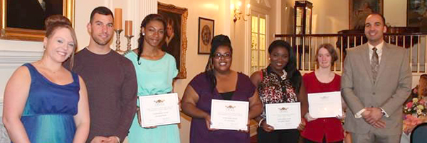 Pictured (from left to right): SGA reps: Chelsea Costello '14 and Christopher Lepley, Achievement Award Recipients: Sarah Brooks (OBC), Tiona Massey (WING), Kehinde Olugbade (TC Soldiers), Christina Ryan (Alliance), and Director of Diversity and Multicultural Affairs, Mark Weir