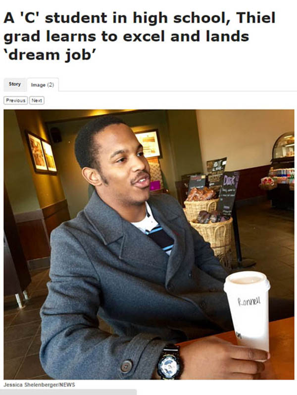 Thiel College alumnus Ronnell Hunt '15 was profiled in the New Castle News on Monday, May 5.