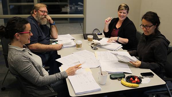 Professors Karen Shaffer (left), Allan Hunchuk, Laura Pickens and Marie Courtemanche work during the assessment phase of the Hodge Institute Tuesday.