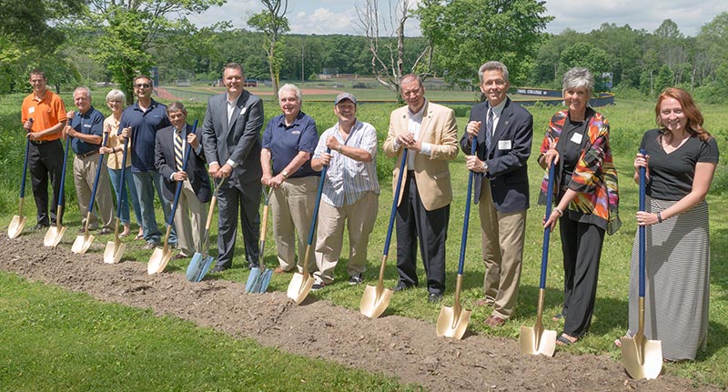 Thiel College broke ground Saturday, May 30 on a new track and field facility that will be located in the Tomcat Park complex. The groundbreaking was part of the inaugural athletics reunion weekend, which also included the 35th Annual Hall of Fame Induction Ceremony and the historic announcement by Rod Wilt '86 and Jill (Gardner) Wilt '85 to endow the wrestling coach position.