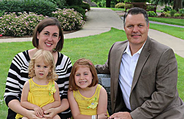 Stephanie Voland, M.Div., '08 and her daughters, Charlotte and Gabrielle, and Thiel College President Troy D. VanAken, Ph.D.