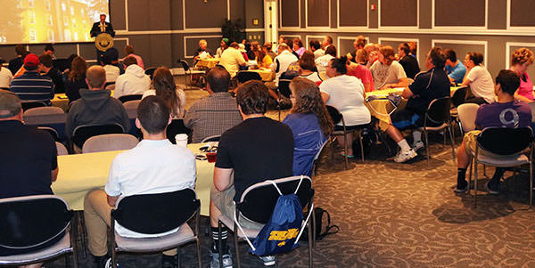 Bob Schmoll, M.B.A., vice president for finance and management, addresses students during Wednesday's accepted student registration day.