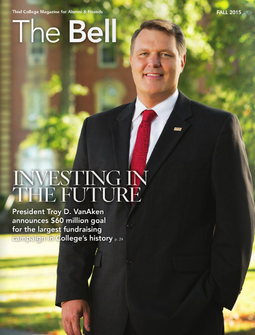 The Fall 2015 edition of The Bell is full of great photos from many campus events, including move-in day and orientation, Homecoming and Academic Honors Convocation. Read about the accomplishments and goals of the Thiel 2016 Campaign, the largest fundraising campaign in the College's 149-year history. Other highlights include a letter from Campaign Cabinet and Board of Trustees Chair Barry Stamm, M.D. '70; a Board of Trustees profile of John Frangakis, M.B.A.; and a new faculty profile on Assistant Professor of Psychology Kristel Gallagher, Ph.D., as well as news and updates from around campus.