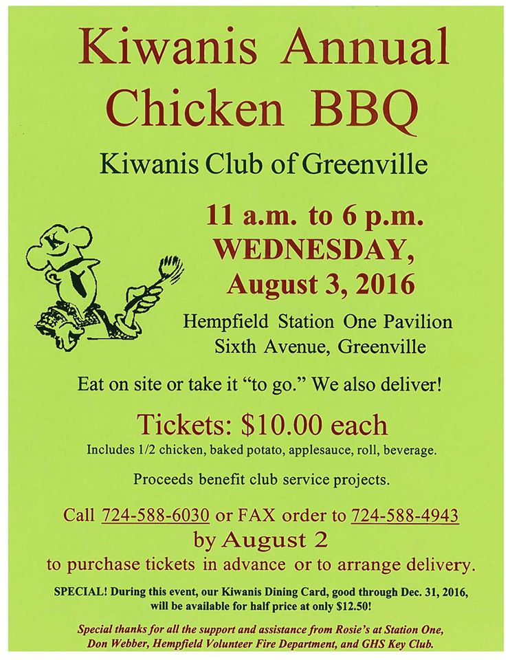 Tickets for the Kiwanis Club of Greenville annual chicken BBQ dinner cost $10 each. Meals include half a chicken, baked potato, applesauce, roll and a beverage. Orders should be placed by Aug. 2. During this event, the Kiwanis Dining Card, good through the end of the year, will be available for $12.50.