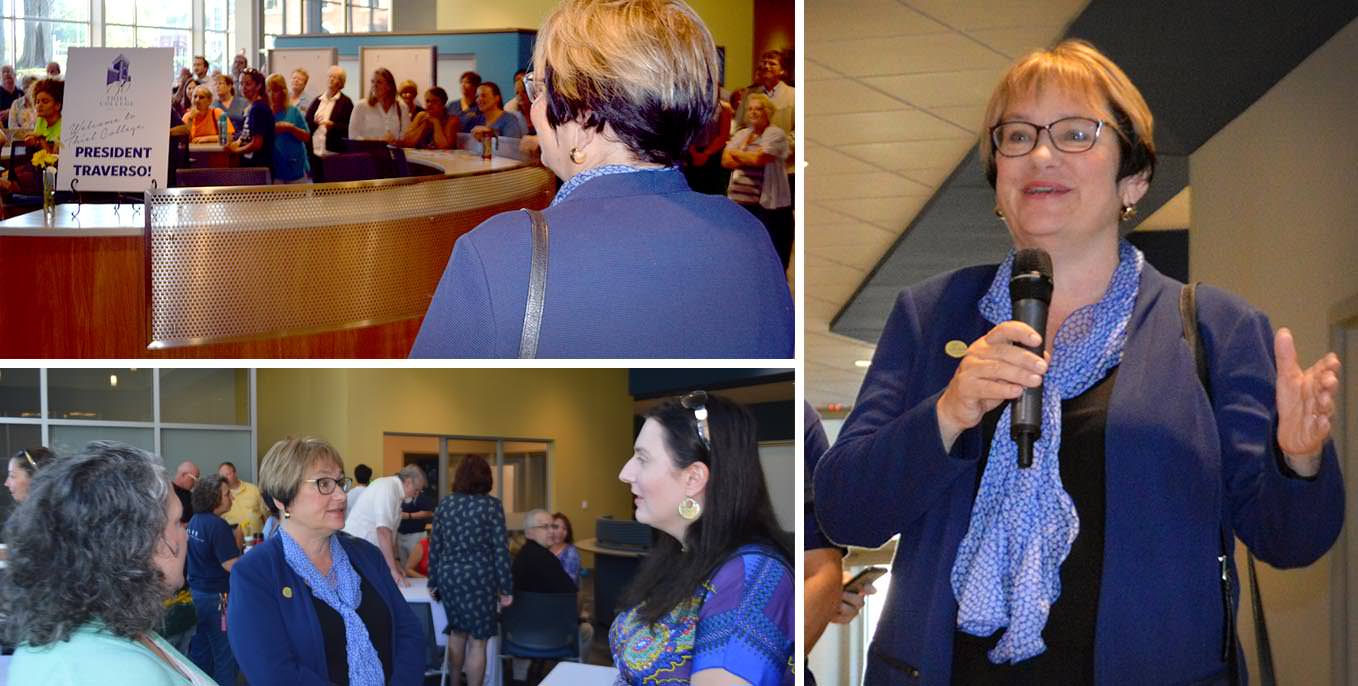 On Tuesday, more than 100 members of the campus community greeted President Traverso in the collaboration area of the James Pedas Communication Center at a surprise reception. Vice President for Finance and Management Bob Schmoll welcomed Traverso. She spoke briefly about the excitement of the arriving and returning students and maintaining Thiel College’s positive momentum.