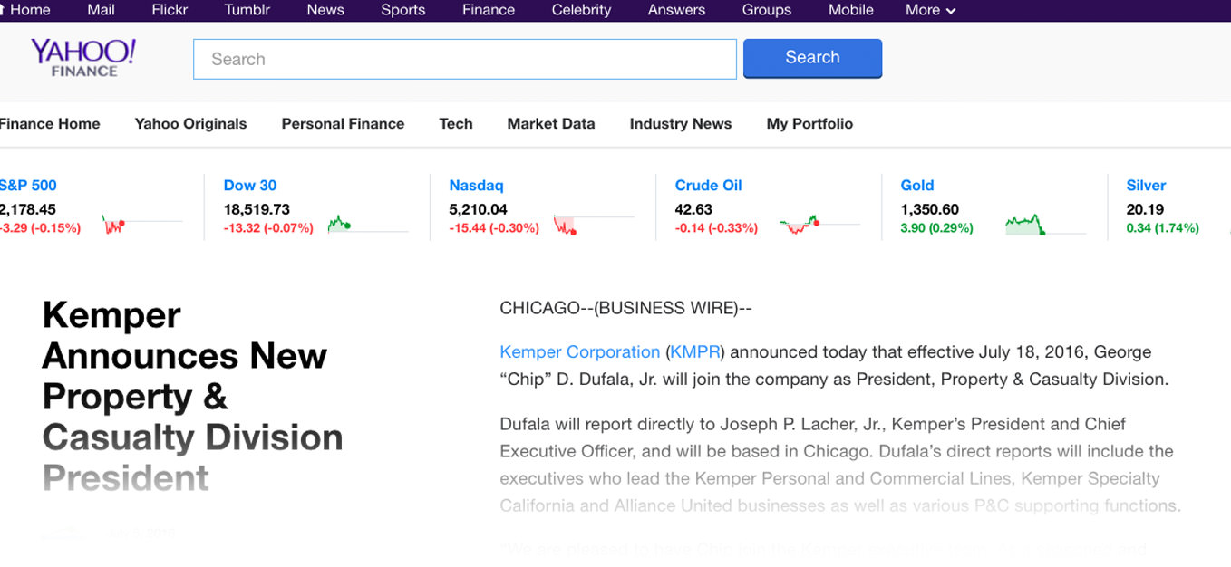George “Chip” D. Dufala Jr. ’92 attracted national attention in the insurance industry when the news broke in early July that he would be joining Kemper Corporation as the company’s President, Property and Casualty Division. According to the Office of Communications and Marketing media monitoring service, this was the most-read College-related news in the past month.
