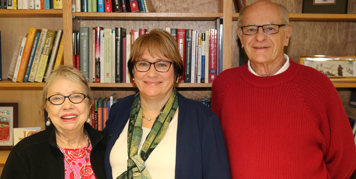The 20th president of Thiel College Susan Traverso, Ph.D., met with the 16th president of Thiel College Carlyle Haaland, Ph.D., and his wife, Mary, on Wednesday morning.