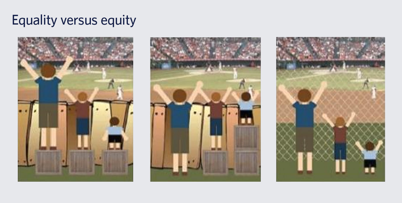 In the first image, it is assumed that everyone will benefit from the same supports. They are being treated equally. In the second image, individuals are given different supports to make it possible for them to have equal access to the game. They are being treated equitably. In the third image, all three can see the game without any supports or accommodations because the cause of the inequity was addressed. The systemic barrier has been removed. The illustration depicts the process of change and the ultimate goal: removal of systemic barriers.