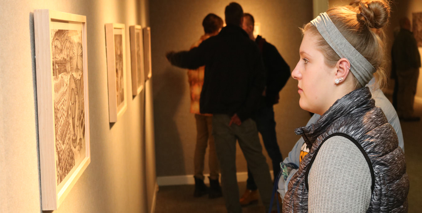 Sami Kurchena ’20, a conservation biology major from Bridgeville, Pa., was among the students and staff at Tuesday’s art gallery talk for Benedict Oddi. The exhibition is in the Weyers-Sampson Art Gallery and continues through to Feb. 17.