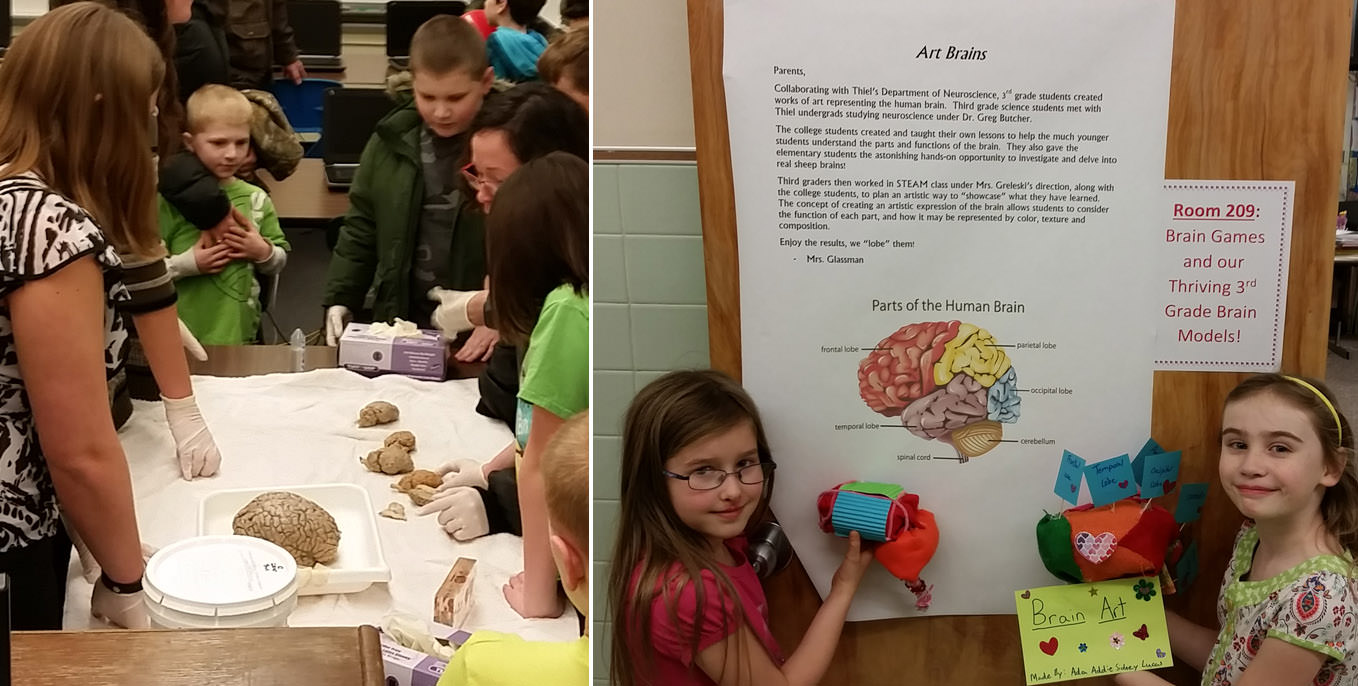 Students in the Introduction to Neuroscience class of Associate Professor of Neuroscience and Department Chair Greg Butcher, Ph.D., have been working on several outreach activities with the Greenville schools to fulfill their citizenship practicum requirement. The students visited the third grade at Hempfield Elementary to teach the basics of neuroanatomy, and then returned over the next few weeks to help the students build their own brain models. The class also visited the fifth grade at East Elementary and conducted a sensory test to help the children review the scientific method. The data collected by the fifth graders were then coded and analyzed by the neuroscience students and will be later used in the fifth grader’s math class. Both projects and several brain games were presented at the school’s Science Night on March 2 with members of the class and other neuroscience majors.