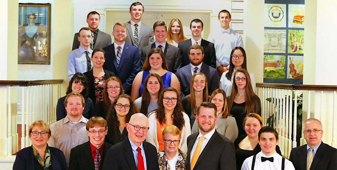 The new members pictured are members of the Class of 2020: Cassie Bullian, Angela Campbell, Jessica Campbell, Jake DeRue, Claire Facemyer, Shyann Foreman, Chase Gifford, Mariel Hanely, Laura Hardner, Samantha Kurchena, Breanna Mesich, Margaret Nee, Jacob Paci, Justin Pearce, Ashley Prout, Marissa Ramirez, Crystal Sams, Marquett Samuels, Olivia Stone, Quinn Ursprung, Dante Vaniel. Professor David M. Miller ’61 was inducted as an honorary member. Missing from the picture are new members Zechariah Dubel, Jack Fontana and Andrew Giesey. Anna Reinsel, Ph.D. ’06 and John Hauser ’71 serve as advisers.