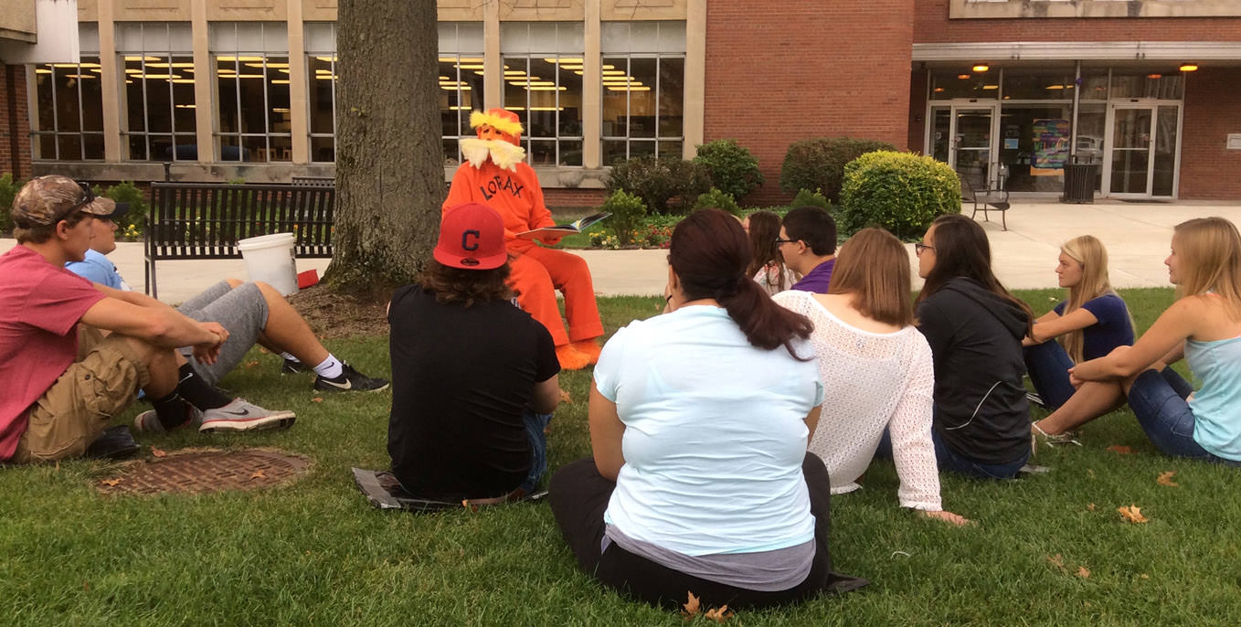 Early childhood education majors began their science pedagogy class this semester when Professor Julie Harris took students outside and read to them dressed as the Lorax, a character in the children’s book “The Lorax” written by Dr. Suess that chronicles the plight of the environment. Education majors will participate in Project Learning Tree, Project Wild, create science curriculum units, teach science lessons at Jamestown Elementary School and many other hands-on science lessons during the semester.