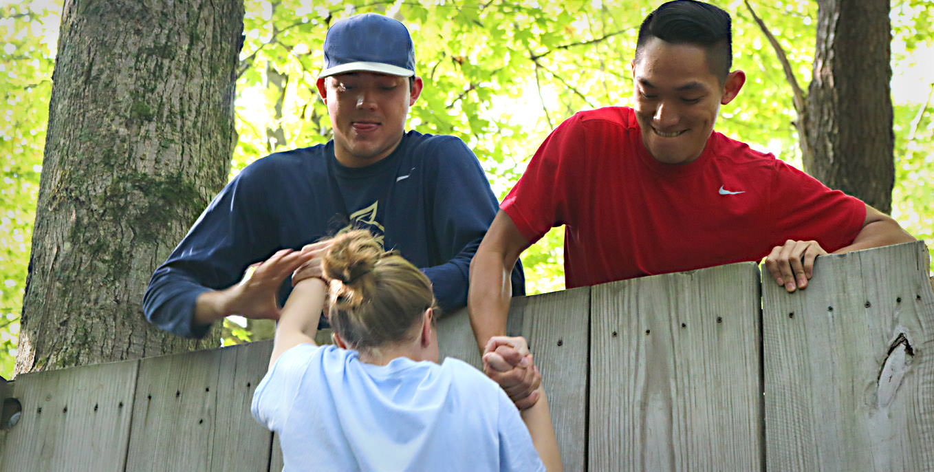 Professor of Business Administration and Accounting Angelo Giannini took his business students into the woods on Monday to experience some team building activities that included taking on the ropes course and wall climbing obstacles and completing a trust fall.