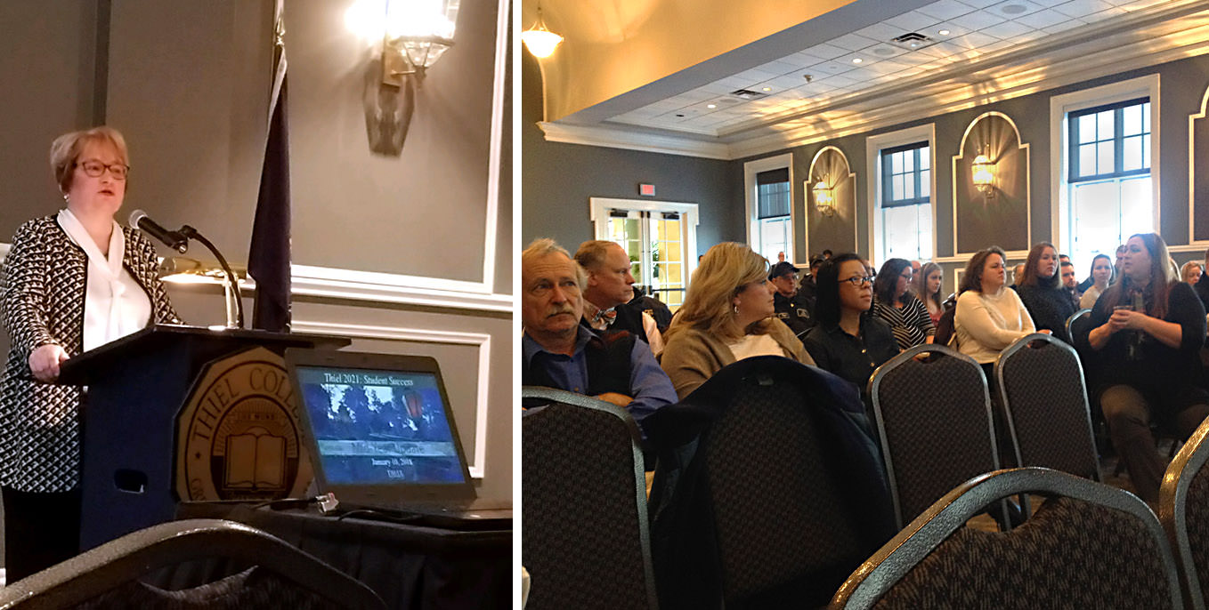 President Susan Traverso, Ph.D., addressed the faculty and staff members with her second annual State of the College address in the Lutheran Heritage Room Wednesday. During the session, new faculty and staff introduced themselves and Founders’ Day winners were announced.
