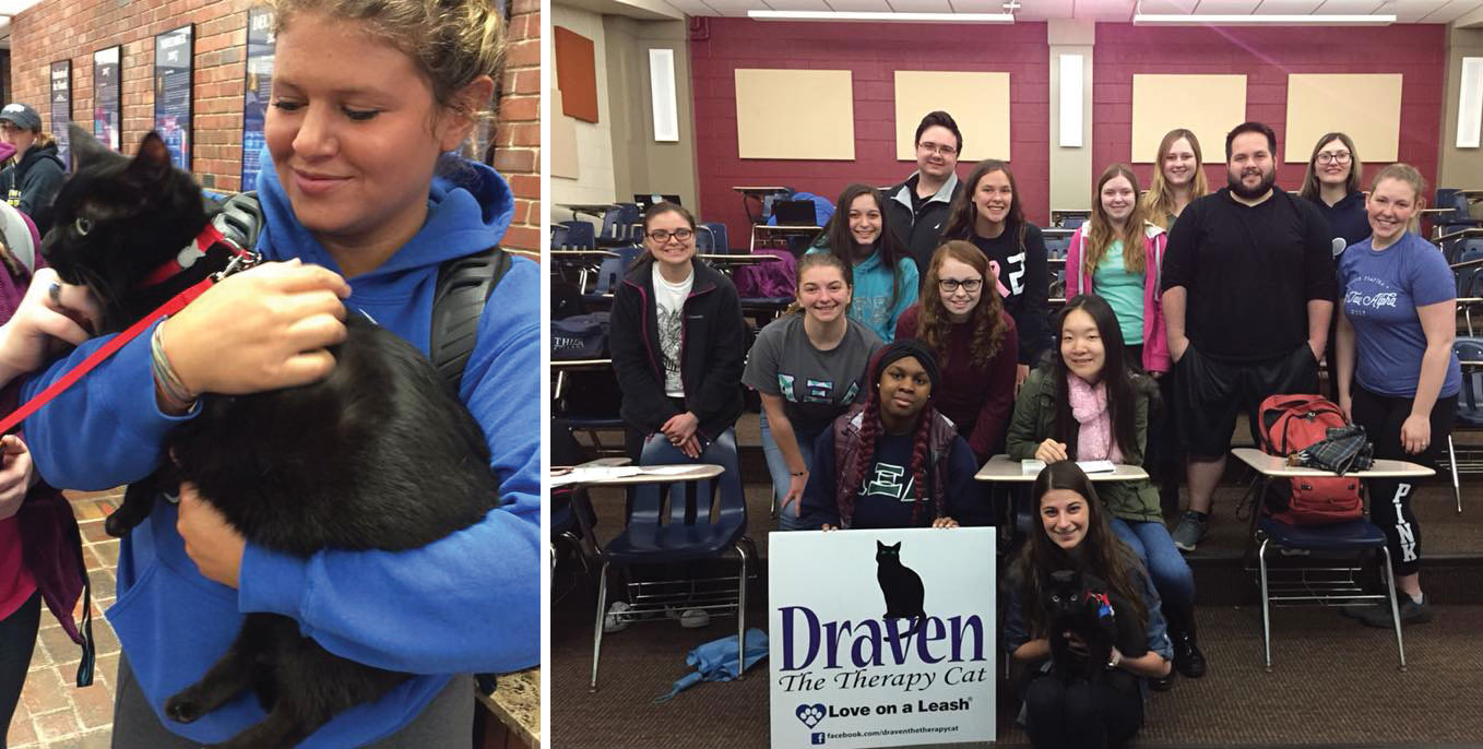Students in the health psychology class of Kristel Gallagher, Ph.D., got a first-hand look at the effect therapy pets can have on student well-being. Draven the Therapy Cat visited the class and then spent time with students in the lobby of the Academic Center.