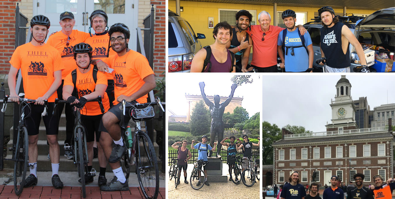 In May, the Thiel College Cycling Club undertook a Cross-Commonwealth Sprint from Greenville to Philadelphia. Frank Jackson ’18, Fred Kiser ’66, Nick McNutt ’17, Cody Wagner ’19, Hunter Young ’18 and staff advisor Martin Black covered 404 miles in four days: From Mercer County’s scenic River Road and the Butler-Freeport Community Trail of Western PA, to the famous Ghost Town Trail of Indiana and Cambria counties, through historic York and Lancaster counties ultimately to Rocky Balboa’s famous statue and Independence Hall of Philadelphia.